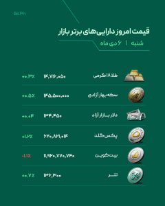 🥇 قیمت برترین داراییهای بازار – ۶ دی! به نقل از صرافی بیت پین همانطور که در تصویر مشاهده میکنید طلا همچنان در ردیف اول برترین دارایی ها دیده میشود. بنظر شما این برتری بین طلا و بیت کوین همچنان در سال جدید باقی خواهد ماند؟
